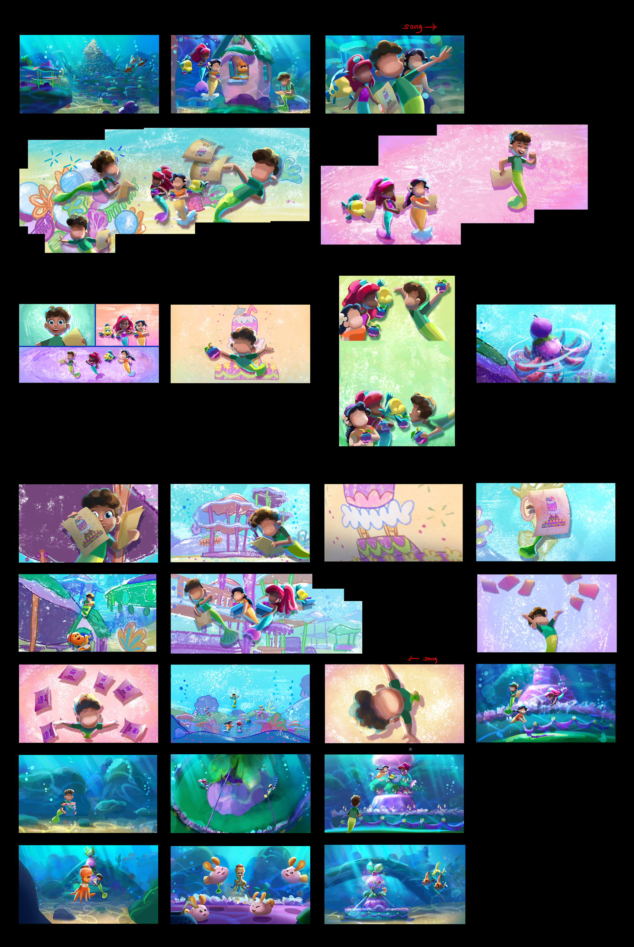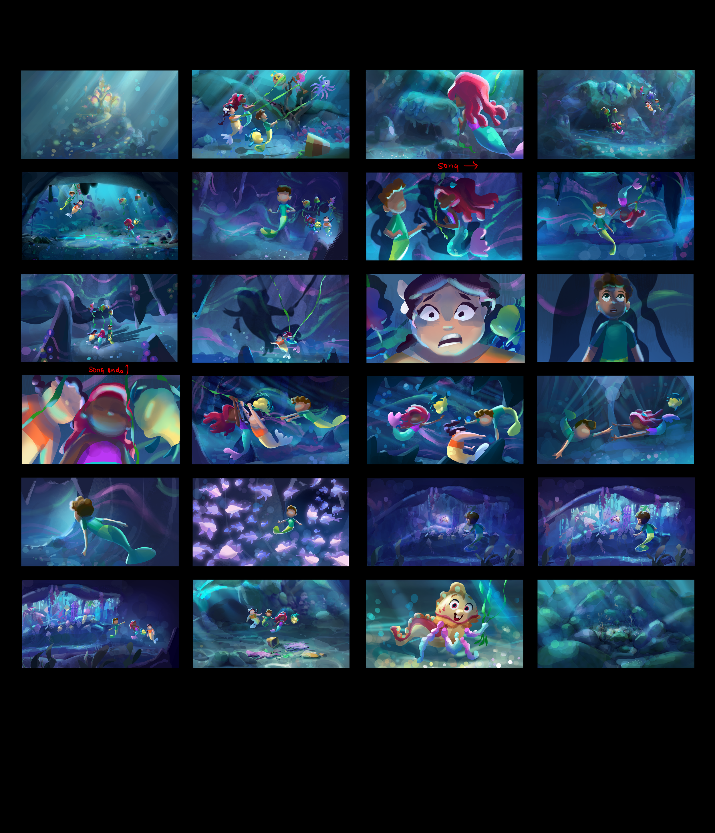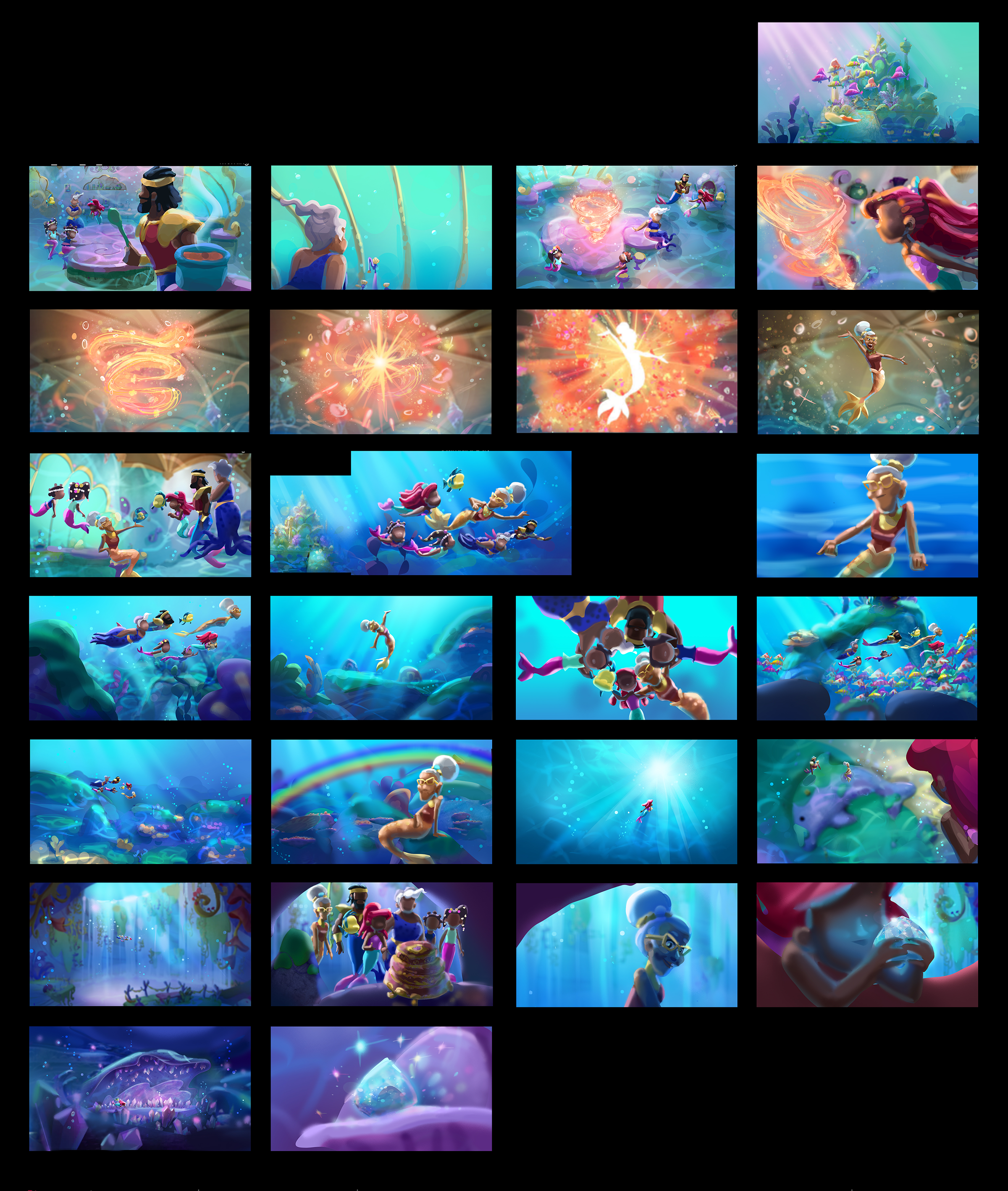 I had the fin-tastic opportunity to work on color scripts for the new Disney Jr. show. Predesigns were originally more in line with the typical preschool color palette, which tends to be more saturated in color. The challenges came when we pivoted to a more realistic approach of being underwater. I am really proud of being able to handle lighting underwater worlds and colorful characters now!